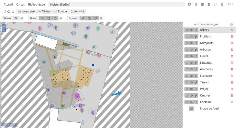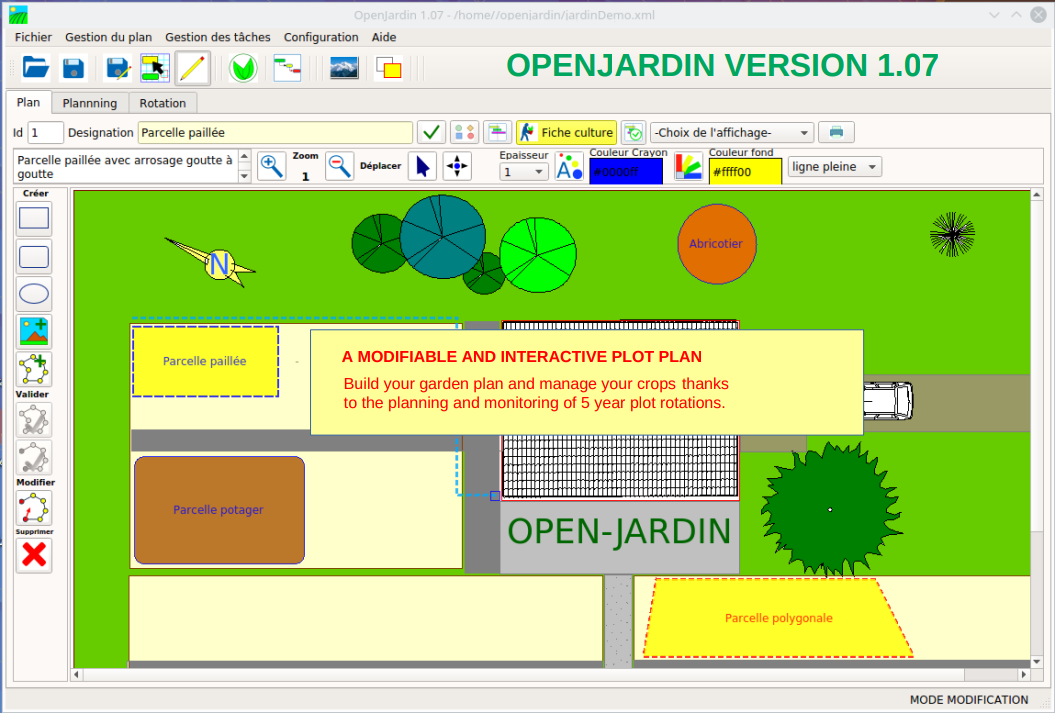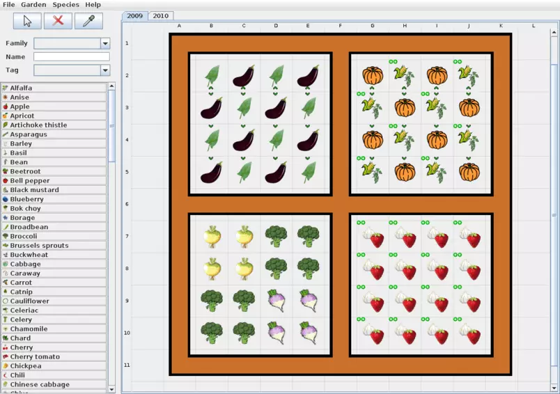 a garden map is made with tiles, a garden each year. along multiple years some indications about rotation and proximities are displayed.